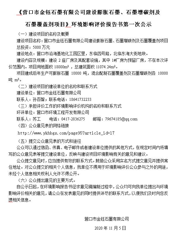 《營(yíng)口市金鈺石墨有限公司建設(shè)膨脹石墨、石墨增碳劑及 石墨覆蓋劑項(xiàng)目》環(huán)境影響評(píng)價(jià)報(bào)告書(shū)第一次公示