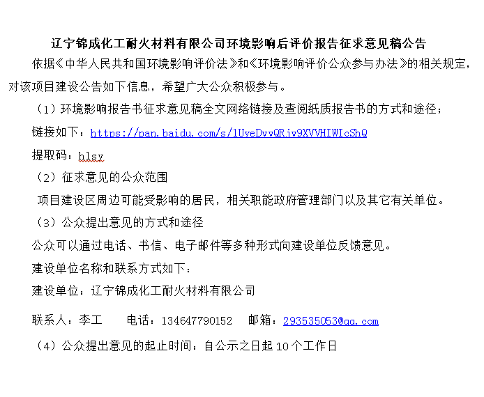 遼寧錦成化工耐火材料有限公司環境影響后評價報告征求意見稿公告