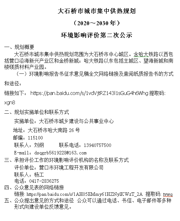 大石橋市城市集中供熱規劃 (2020~2030年) 環境影響評價第二次公示